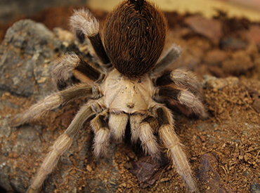 Spider Lings: Divided into two body segments: Cephalothorax and abdomen. The cephalothorax is grey to dark brown and the abdomen is dark brown to black. The body is covered entirely with hair that forms a pad below the tip of each of the 8 legs. This species eats crickets and other large insects. They may live for up to 20 years. In captivity, females have been known to live for 25 years. This is a long-lived but slow growing species.