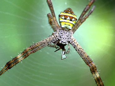 St Andrews Cross Spiders look just like a cross suspended between a tangled web. They use thick zigzag bands of silk in their webs that may attract insect prey by reflecting ultra violet light. St Andrews Cross Spider make suspended, sticky, wheel shaped orb webs. Webs are placed in low shrubby vegetation. The banded upper abdomen is named after the bluish-white cross-shaped pattern of silk through the centre of the web resembling the St. Andrews cross on the Scottish flag. The male is smaller than the female. They are usually calm and not aggressive and the bite of the St Andrew’s Cross Spider poses a very low risk for humans. These spiders wrap silk webs around vegetation to trap insects like flies, mosquitoes, butterflies and smaller bugs. They usually wrap the silk web neatly around the prey to prevent it from escaping and then slowly inject their venom to paralyze the prey before eating it.